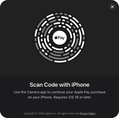 Apple Pay availability depends on the payer’s device, browser, and operating system. In some cases, a QR code will appear on screen that can be scanned with an iPhone to complete the payment. If Apple Pay is not already set up, the customer will be prompted to complete setup before continuing.